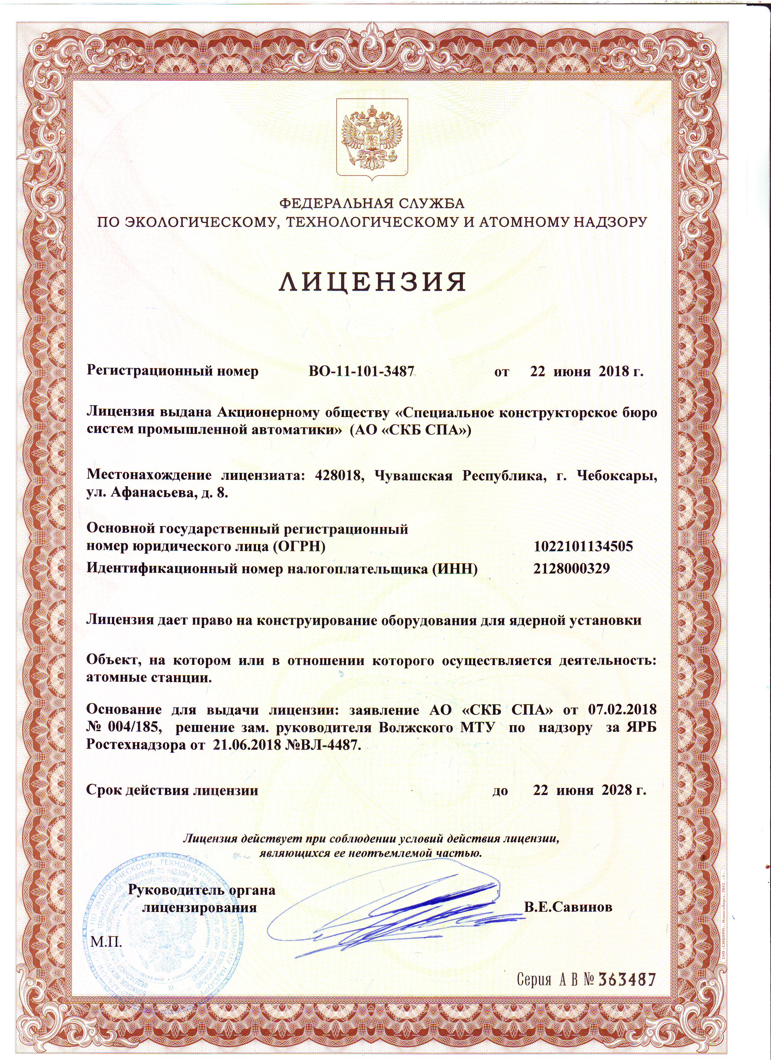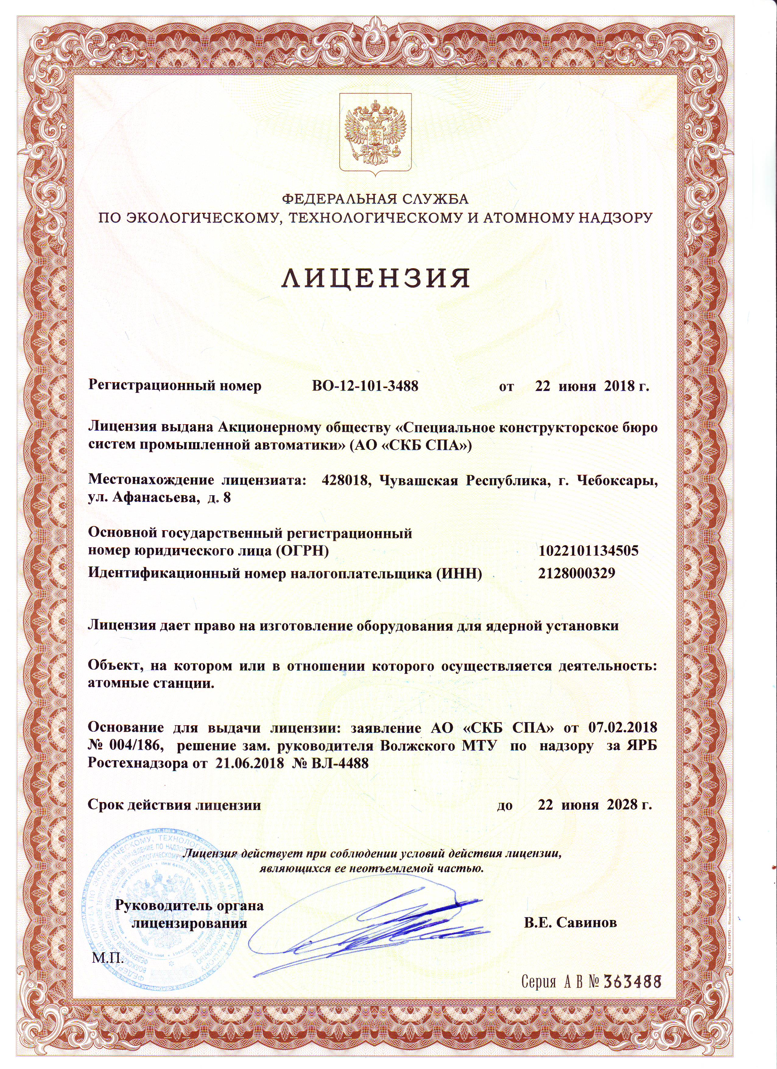 Для осуществления своей деятельности АО <СКБ СПА> имеет необходимые разрешительные документы: лицензии Федерального надзора России по ядерной и радиационной безопасности (Госатомнадзор), лицензию Управления ФСБ РФ по Чувашской Республике, сертификаты соответствия продукции требованиям Госстандарта, сертификаты и декларации Таможенного Союза, сертификат соответствия системы менеджмента качества и др.